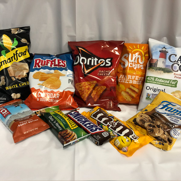 Contents: Ruffles Cheddar Sour Cream (4), Famous Amos Chocolate Chip Cookies (4), Snickers (4), Sun Chips - Cheddar (4), Cliff Bar (Various Flavors) (4), Nature Valley - Oats & Honey Bar (4), Smart Popcorn - White Cheddar (4), Cape Cod Regular Chips (4), Doritos - Nacho Cheese (4), M&M Peanuts (4)